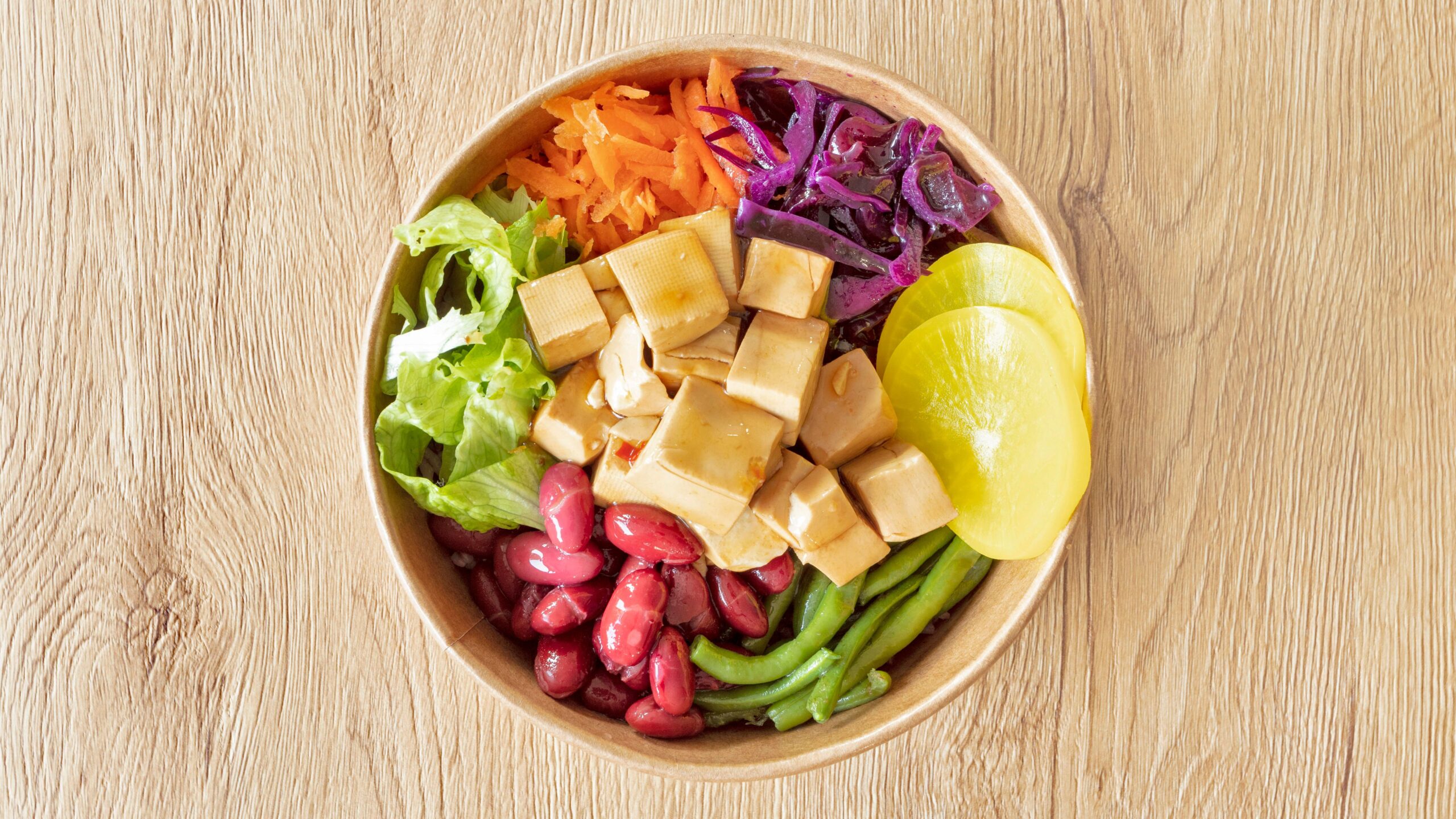 Riz violet (mélange de riz blanc et noir), poulet frit au gingembre, carottes, salade, choux rouges, haricots verts, haricots rouges, radis jaune, 1 topping au choix et 1 sauce au choix.